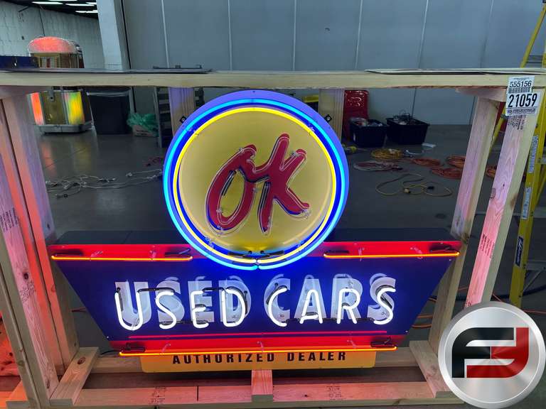 Custom Ok Used Cars Tin Neon Sign, 64" x 48", New neon glass, transformers and GTO wiring, On a die cut metal can with hanging brackets, Crated for transportation